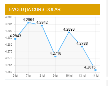 Moneda autohtonă s-a întărit în schimb în faţa dolarului american, cotat indirect în piaţa românească prin raportare la paritatea euro/dolar, a ajuns astăzi, 14 iulie, la 4.2615 lei, în scădere cu 0.0173 lei față de ziua de luni, 13 iulie.