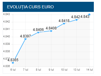 Leul a pierdut teren în faţa monedei unice europene, potrivit datelor publicate de Banca Naţională, anuntand un curs de de 4.8430 lei pentru un euro, o creștere cu 0.07 lei față cursul euro atins luni, 13 iulie, conform BNR, când moneda europeană valora 4,8423 lei.