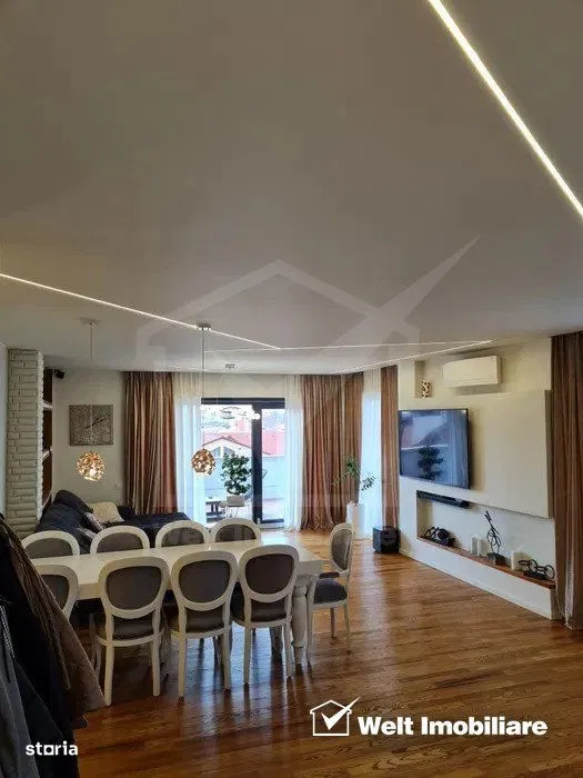 Locuința are o scară interioară și o suprafață utilă de 177 metri pătrați, la care se adaugă 35 de metri pătrați de terasă. La primul nivel se găsesc patru camere mari și dormitoare cu dressinguri spațioase. Cele două băi au fost finisate cu marmură premium, iar bucătăria vine complet utilată și mobilată cu electrocasnice de ultimă generație.