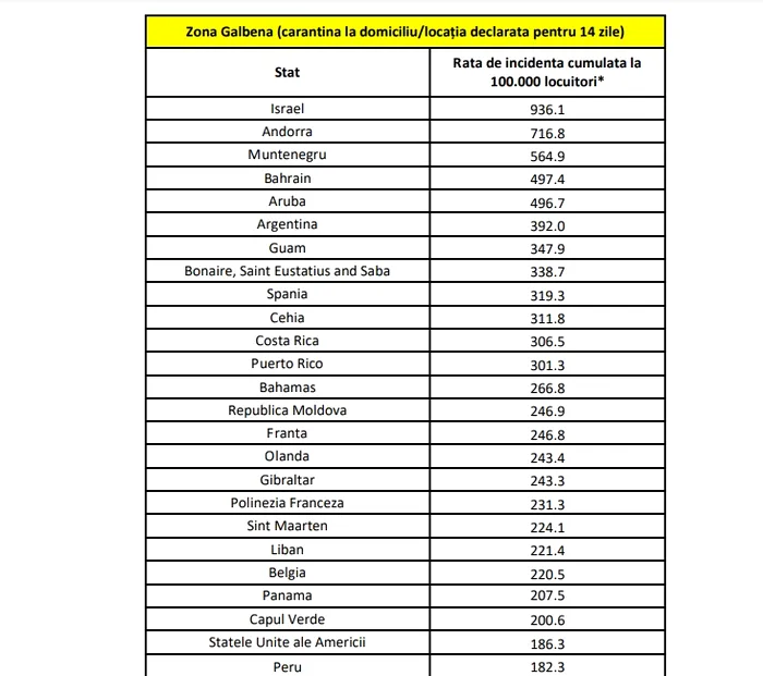 Comitetul Național pentru Situații de Urgență(CNSU) anunță, miercuri seara, suspendarea zborurilor disspre statele prevăzute în lista țărilor și a zonelor cu risc epidemiologic ridicat, aprobată prin hotărârea CNSU din 5 octombrie 2020. Pe lista statelor din zona galbenă de risc se află Statele Unite ale Americii, Israel, Ucraina sau Muntenegru. Sunt exceptate de la decizie statele UE aflate pe „lista galbenă”, printre care Franța, Spania, Austria Ungaria, dar și Marea Britanie, Emiratelor Arabe Unite și Qatar.