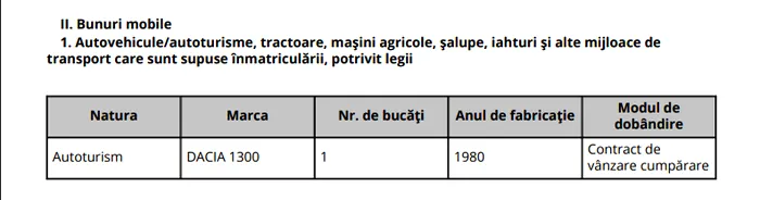În declarația de avere pe care a depus-o în iunie 2025, alesul a trecut o singură mașină: o Dacia 1300, an de fabricație 1980.