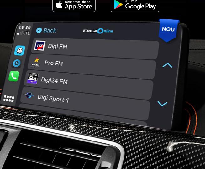 Aplicația Digi Online Audio este compatibilă cu sistemul Apple CarPlay al mașinii, așa că poți lua cu tine la drum cele mai importante stații radio, dar și o serie de canale TV.