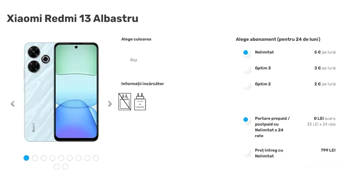 Digi RCS-RDS oferă un Xiaomi Redmi 13, cu abonament pentru 24 luni la alegere: Nelimitat: 5 euro pe lună / Optim 3: 3 euro pe lună / Optim 2: 2 euro pe lună), dar și în rate portare prepaid / postpaid cu Nelimitat x 24 rate (0 lei avans, 33 lei x 24 rate).