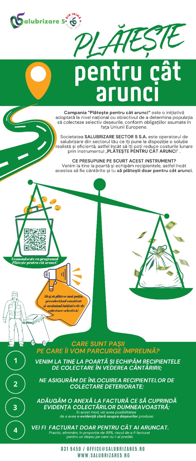 Potrivit Salubrizare Sector 5 S.A., programul „Plătește pentru cât arunci” este un demers economic ce promovează conștientizarea populației despre impactul deșeurilor.