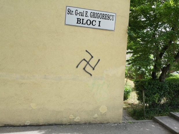 Zvastica a fost desenată pe mai multe blocuri, garaje şi un panou amplasat pe un loc de joacă dintr-un cartier din Cluj-Napoca, iar Poliţia a întocmit un dosar penal şi efectuează cercetări pentru răspândirea simbolurilor cu caracter fascist, rasist şi xenofob.
