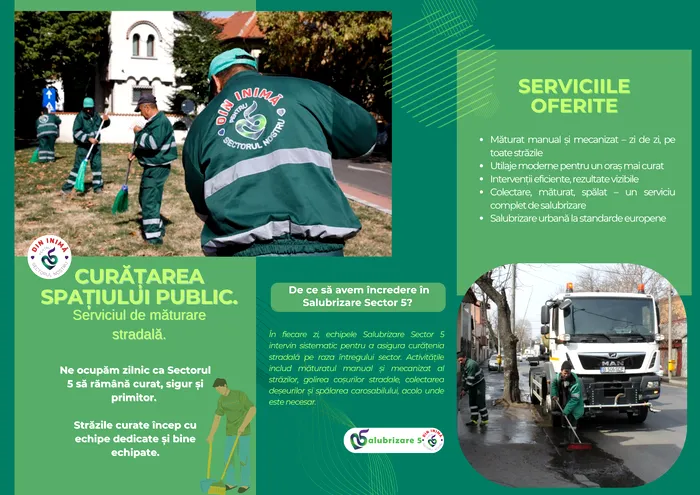 „În fiecare zi, echipele Salubrizare Sector 5 intervin sistematic pentru a asigura curățenia stradală pe raza întregului sector. Activitățile includ măturatul manual și mecanizat al străzilor, golirea coșurilor stradale, colectarea deşeurilor și spălarea carosabilului, acolo unde