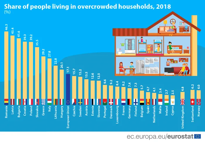În Uniunea Europeană, 17,1% din populaţie trăia în anul 2018 în gospodării supraaglomerate, adică numărul camerelor era insuficient comparativ cu numărul membrilor din gospodărie, pe primul loc în rândul statelor membre fiind România, unde aproape jumătate din populaţie (46,3%) trăia în urmă cu doi ani în gospodării supraaglomerate, arată datele publicate miercuri de Eurostat.