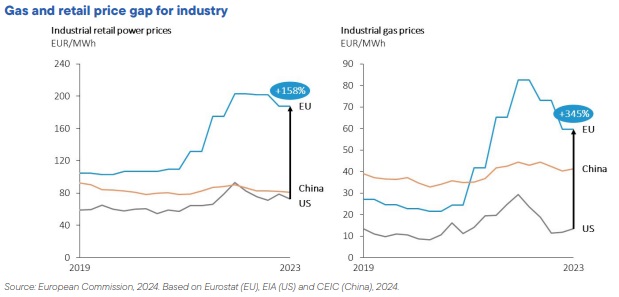 Potrivit documentului, prețurile cu amănuntul și cu ridicata la gaze sunt în prezent între trei și cinci ori mai mari decât prețurile din SUA, în timp ce, istoric, prețurile în UE au fost de două până la trei ori mai mari decât cele din SUA. Prețurile de vânzare cu amănuntul la energie electrică – în special cele pentru sectoarele industriale – sunt în prezent de două până la trei ori mai mari decât cele din SUA și China. În mod tradițional, prețurile cu amănuntul la electricitate în UE au fost cu până la 80% mai mari decât cele din SUA, în timp ce în trecut erau cam la aceluiași nivel ca în China.