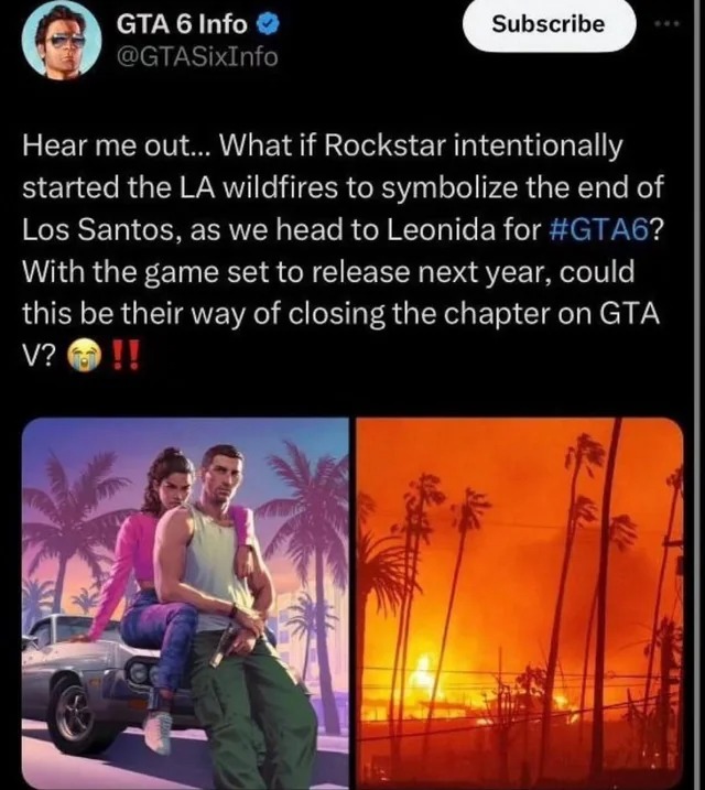 Din păcate, cunoscutul cont pe subiectul GTA 6, intitulat GTASixInfo, a promovat o teorie a conspirației cel puțin bizară, potrivit căreia incendiile din Los Angeles au fost puse de… cei de la Rockstar Games… ca parte a „ultimului capitol” din GTA V, joc video ce se desfășoară în San Andreas, un „facsimil” al Los Angeles-ului.