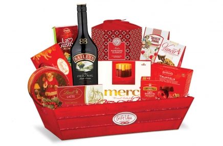 Acest coș cadou, împachetat într-o cutie cadou din carton elegantă, care imită marmură neagră, conține: un vin roșu sec Bordeaux Les Petites Caves D.O.C., Merci tabletă de ciocolată neagră, Lindt Praline Lindor ciocolată neagră, Dallmayr Espresso Monaco cafea măcinată în cutie metalică. Este un cadou elegant și rafinat, ce va fi apreciat.