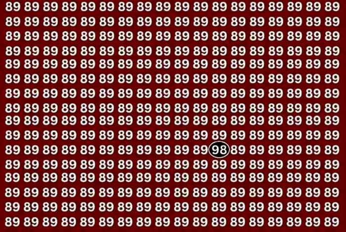 Imaginea de mai sus trebuie să fie privită cu o atenție deosebită, pentru a găsi numărul 98. Unde se află, oare, acest număr? La prima vedere, se pot observa rânduri și coloane în care apare numărul 89. Însă, „intrusul” se ascunde printre toate aceste numere. Există 16 rânduri și 18 coloane în care apare acest număr. Totuși, într-un anumit „pătrat” există și 98.