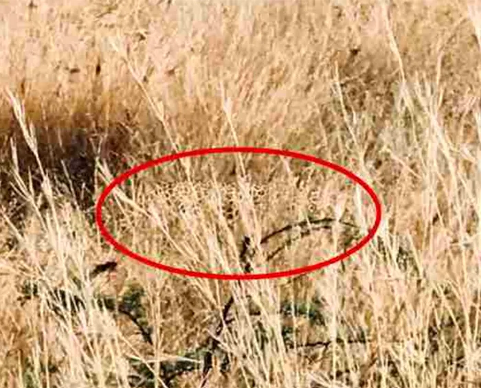 Animalul este în stânga imaginii. Poți observa petele întunecate? Este un leopard perfect camuflat, care așteaptă prada în tufișuri.