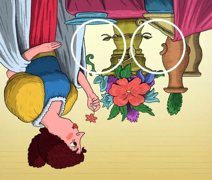 Poate părea prea dificil să le găsești, dar dacă înclini imaginea cu susul în jos, vei putea să-i vezi pe ambii oaspeți. În jurul vazei de flori pot fi văzute fețele a doi invitați.