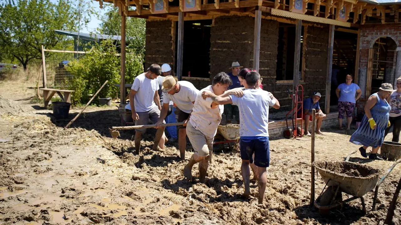 Sute de voluntari, printre care și copiii din cadrul DGASPC Ilfov (Centrele Săftica și Domnești), au participat la reconstrucția pereților casei vechi din 1932, care au fost reumpluți cu pământ și paie.