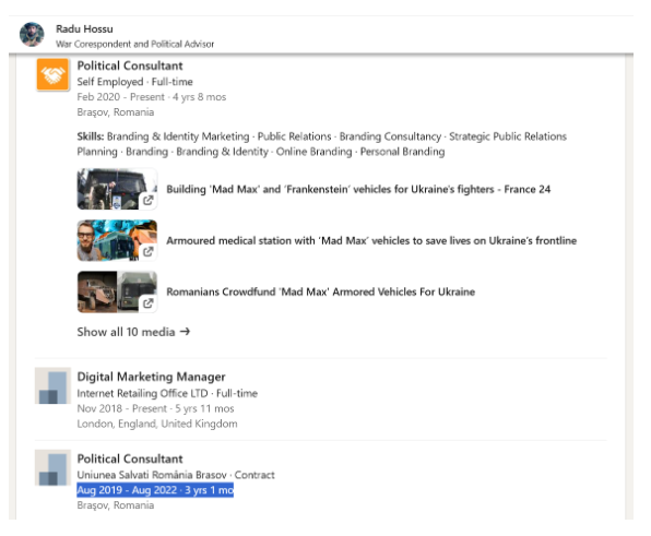 El a ocupat poziția respectivă, conform profilului propriu de Linked.in pentru trei ani la USR (2019 – 2022) concomitent cu alți patru ani (2020 – 2024) pentru alte entități nenominalizate.