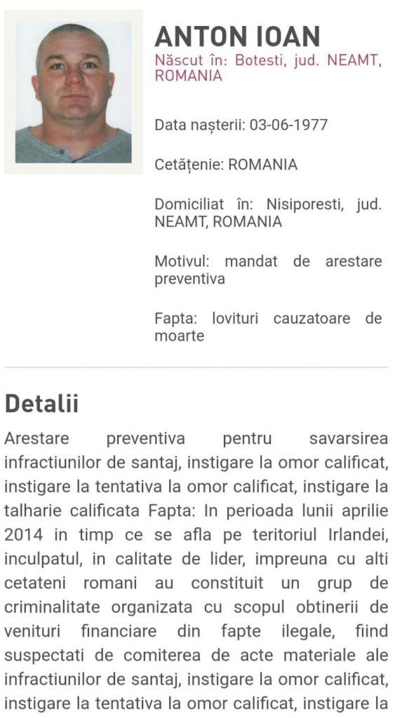 În urma cooperării polițienești dintre România și Irlanda, liderul unei grupări de criminalitate organizată, ce acționa în Irlanda, a fost depistat. Acesta era urmărit la nivel internațional pentru comiterea infracțiunilor de constituire a unui grup infracțional organizat, şantaj, instigare la omor calificat, instigare la tentativă la omor calificat şi instigare la tâlhărie calificată.