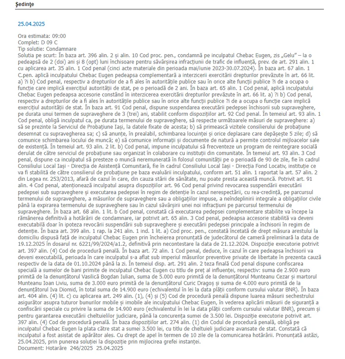 „Inculpatul nu a acționat pasiv, ci dimpotrivă, a avut inițiativa de a aborda aceste persoane, care aveau un interes direct în dosarele penale în care erau implicate, fie ca victime, fie ca suspecți sau inculpați. Comportamentul inculpatului, care a pretins sume de bani sub pretextul că ar avea influență asupra cadrelor medicale pentru a modifica actele medicale ce urmează a fi folosite în dosare penale afectează în mod considerabil încrederea cetățenilor în integritatea sistemului medical și în acurateţea actelor medicale, dar şi în corectitudinea actelor de justiţie”, au arătat judecătorii de la Tribunalul Iași în decizia de condamnare.