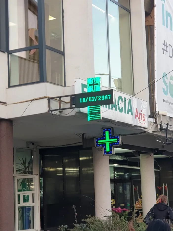 La Iași s-a inventat „mașina timpului”! După cum ne arată fotografia postată de un utilizator pe Facebook , pe grupul  „Ești din Iași dacă…”, crucea cu LED a unei farmacii a ilustrat data 18 februarie 2087.