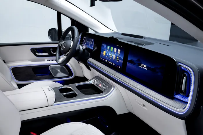 MBUX Superscreen adauga trei ecrane integrate sub o suprafata de sticla: 10,25 inch pentru sofer, 14 inch central si 14 inch pentru pasagerul din fata. Navigatia bazata pe Google Maps include planificarea automata a opririi pentru incarcare si integrare AI prin ChatGPT si Google Gemini.