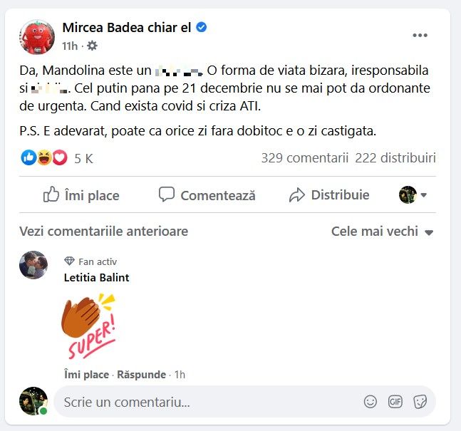 „O formă de viaţă bizară, iresponsabilă şi debilă. Cel puţin până pe 21 decembrie nu se mai pot da ordonanţe de urgenţă. Când există Covid şi criza ATI”, a scris Badea pe pagina sa de Facebook.