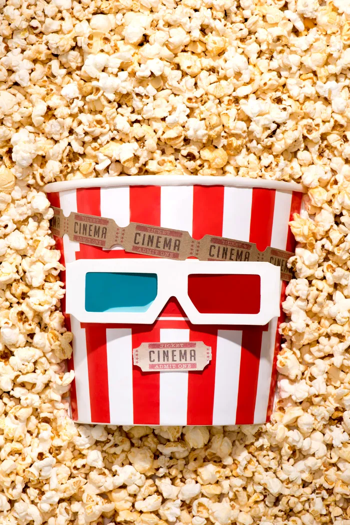 flat lay with arrangement of disposable bucket with popcorn, retro cinema tickets and 3d glasses