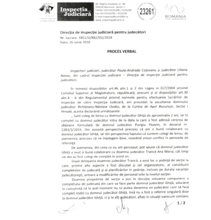 În mod surprinzător, solicitarea a venit, cu toate că – la mijlocul lui 2018 – Richițeanu spunea Inspecției Judiciare că s-a înțeles bine cu judecătorul Ghiță Ciprian, atât în calitate coleg de birou, cât și în calitate de coleg de complet, și că nu au avut vreodată vreo problemă. Tocmai de aceea apar semne de întrebare referitoare la demersurile judecătorului de a-și elimina colegul, pe Ciprian Ghiță.