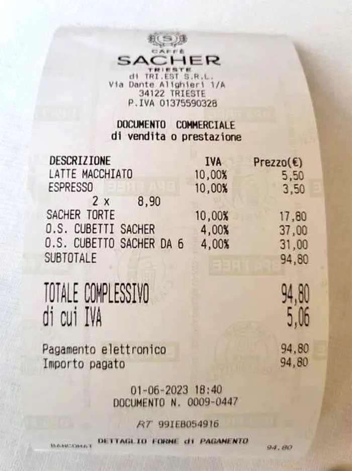 Consumația a fost de 100 de euro, potrivit prețurilor stabilite la proaspăt deschisa cafenea „Sacher”, din stațiunea Trieste, Italia. Felia de tort costă 8,9 euro, dar vorbim despre o prăjitură produsă în celebrul laborator vienez al Hotelului „Sacher”.