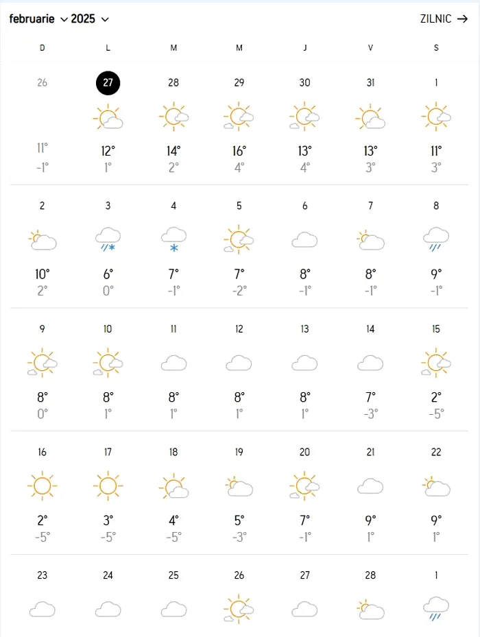 Sfârșitul lunii ianuarie 2025 ne prinde cu vreme bună în București, cu temperaturi de până la 16 grade, de exemplu, miercuri, 29 ianuarie.