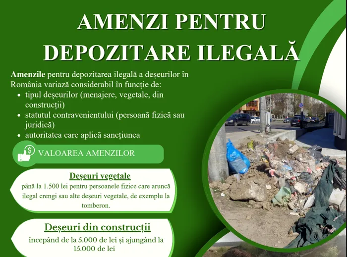 Amenzile pentru depozitarea ilegală a deşeurilor în România variază considerabil în funcție de: tipul deşeurilor (menajere, vegetale, din construcții), statutul contravenientului (persoană fizică sau juridică) și autoritatea care aplică sancţiunea.