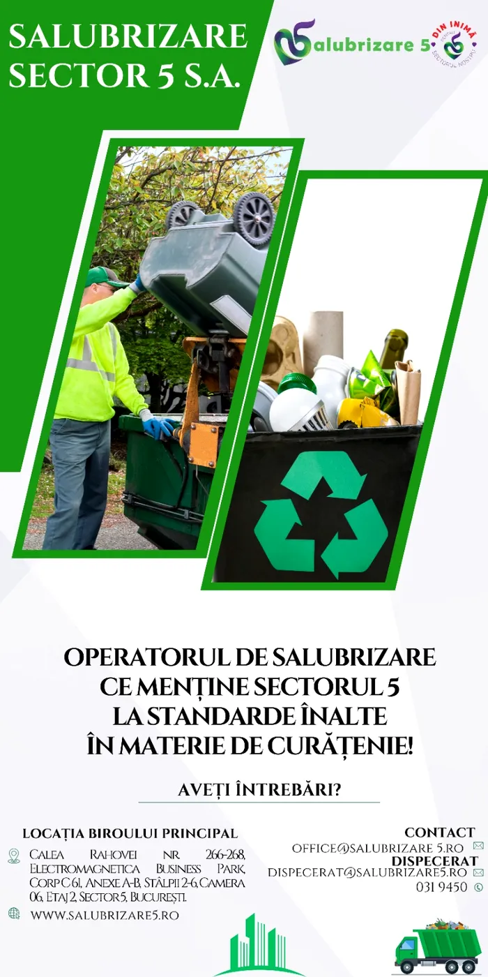 Operatul de salubrizare ce menține sectorul 5 la standarde înalte în materie de curățenie transmite că rămâne la dispoziția locuitorilor pentru întrebări și sesizări.