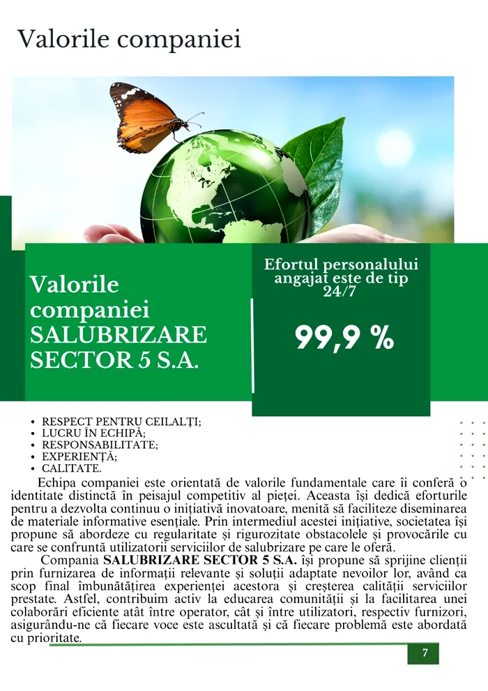 Echipa companiei Salubrizare Sector 5 este orientată de valorile fundamentale care îi conferă o identitate distinctă în peisajul competitiv al pieței. Aceasta îşi dedică eforturile pentru a dezvolta continuu o inițiativă inovatoare, menită să faciliteze diseminarea de materiale informative esențiale. Prin intermediul acestei inițiative, societatea își propune să abordeze cu regularitate şi rigurozitate obstacolele și provocările cu care se confruntă utilizatorii serviciilor de salubrizare pe care le oferă.