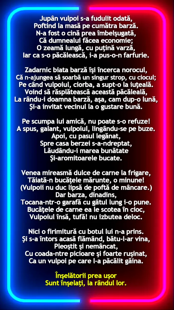 Pe când vulpoiul, ciorba, a supt-o la iuţeală.