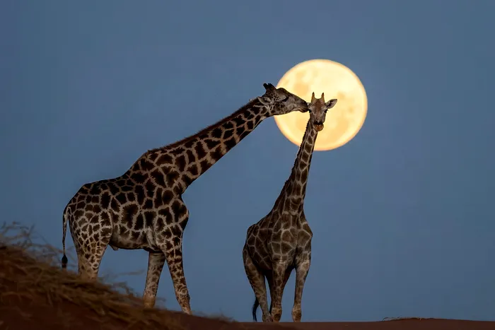 Imaginea uluitoare a lui Goetsch cu o girafă care urcă pe vârful unei dune de nisip, privind în jos prin țeava obiectivului din centrul unei luni roz cețoase, se numără printre cele mai bune dintr-o serie uluitoare de fotografii care l-au ajutat pe sud-african să-și construiască o comunitate impresionantă de urmăritori pe rețelele sociale.