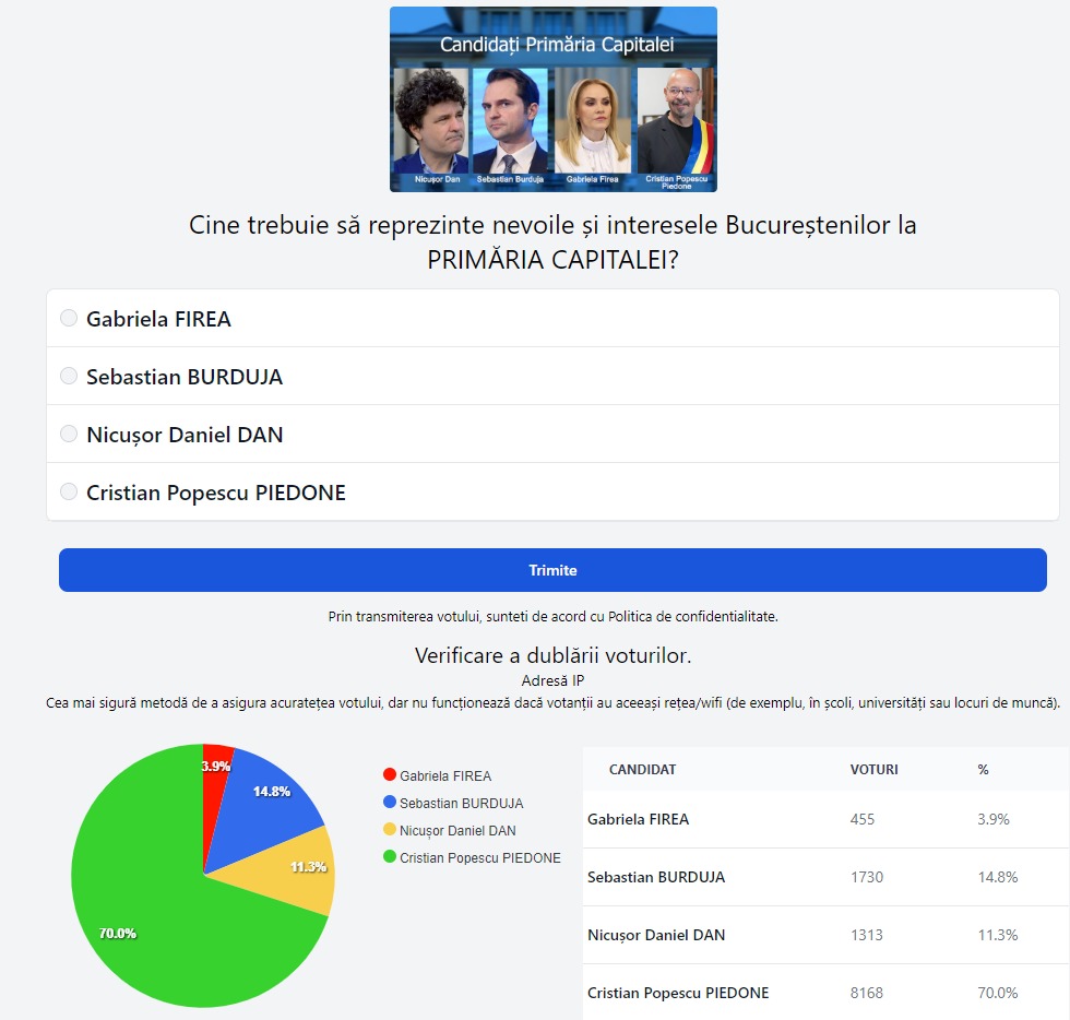 În contextul în care negocierile dintre PSD și PNL pentru desemnarea candidatului unic al Coaliției de guvernare trenează, Cristian Popescu Piedone demarează un sondaj personal pe Facebook pentru candidatul preferat de bucureșteni pentru Capitală. Conform unor sondaje, Piedone ar putea câștiga Capitala în competiție directă cu Gabriela Firea sau Sebastian Burduja cu un procent covârșitor, spre 70%.