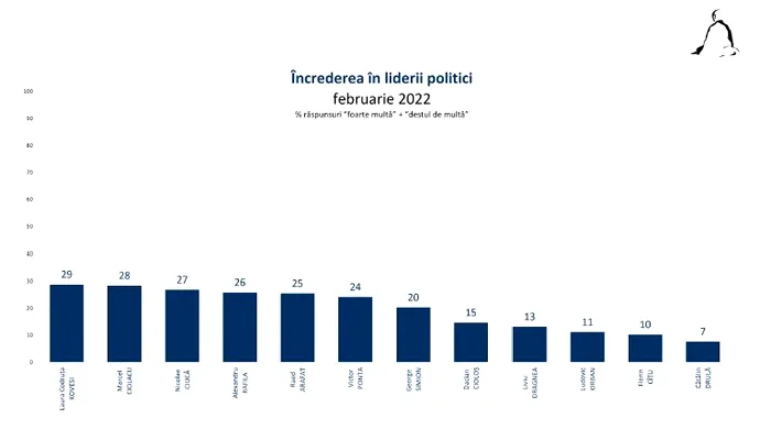Potrivit sondajului, oamenii au cea mai mare încredere în Laura Codruţa Kovesi, fosta şefă DNA – 29%. Urmează Marcel Ciolacu, preşedintele PSD – 28%, apoi premierul Nicolae Ciucă – 27% şi medicul Alexandru Rafila, ministrul Sănătăţii – 26%.