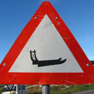 Într-un loc cu foarte puține drumuri și multă gheață, așa cum este Groenlanda, cel mai bun mijloc de a vă deplasa este sania trasă de câini. Indicatorul din imagine poate fi întâlnit pe puținele drumuri din Groenlanda și îi avertizează pe șoferi că ar putea întâlni sănii trase de câini și trebuie să fie atenți.