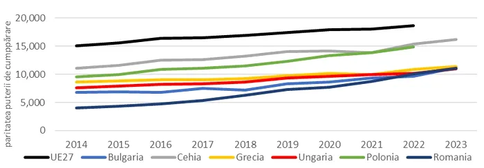 Figura 1. Veniturile mediane pe locuitor anuale nete, exprimate la paritatea puterii de cumpărare / Sursa: elaborat de autor, cu datele Eurostat, 2024, tabela ilc_di03