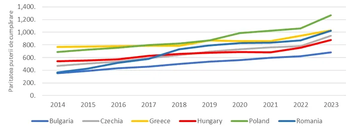 Figura 2. Salariul minim pe economie lunar brut, exprimat la paritatea puterii de cumpărare / Sursa: elaborat de autor, cu datele Eurostat, 2024, tabela earn_mw