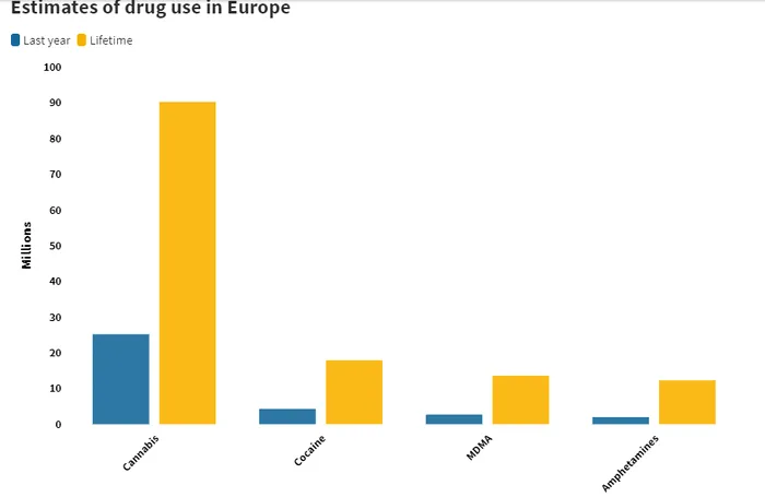 Cannabis-ul rămâne cel mai consumat drog la nivelul UE, cu peste 27% din populația adultă care declară că a consumat măcar o dată în viață acest drog. Următorul drog ca prevalență în UE este cocaina, cu aproape 18 milioane de utilizatori cel puțin o dată în viață. Clasamentul consumului de droguri este completat în ordine de MDMA (pastilele de tip ecstasy), amfetaminele și heroina.