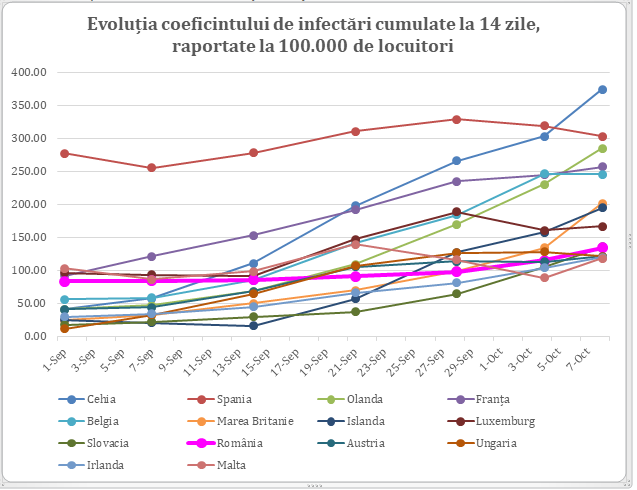 Vă prezentăm în continuare evoluția indicelui de infectări cumulate la 14 zile, raportate la 100.000 de locuitori, pentru 13 state membre ale Uniunii Europene și Regatul Unit al Marii Britanii și Iralndei de Nord, în perioada 1 septembrie 2020 – 8 octombrie 2020.