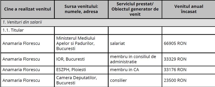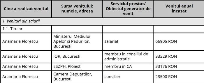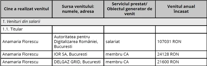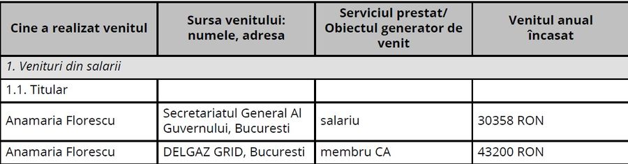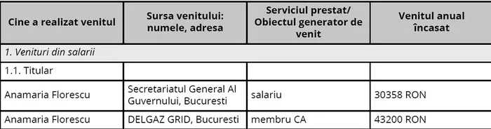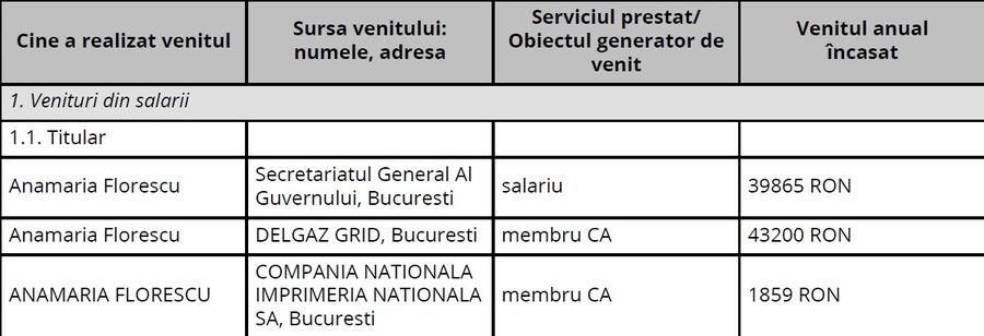 În 2024, tot anul, Anamaria Florescu a încasat 39.865 lei de la Secretariatul General al Guvernului, 43.200 lei ca membru CA la Delgaz Grid, 1.859 lei CA la CN Imprimeria Națională.