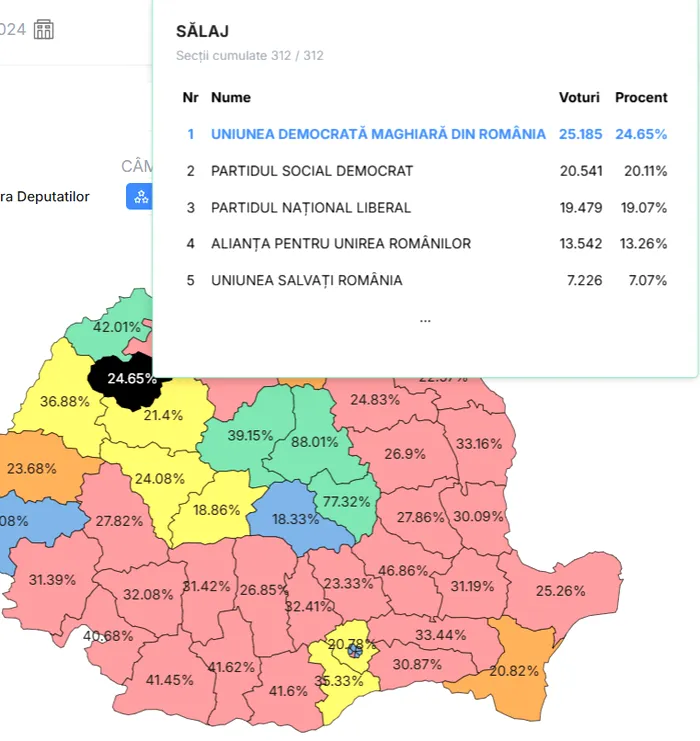 Rezultate Camera Deputaților: UDMR:24,29%, PSD:20,7%, PNL:18,17%, AUR:12,67%, USR:6,81%