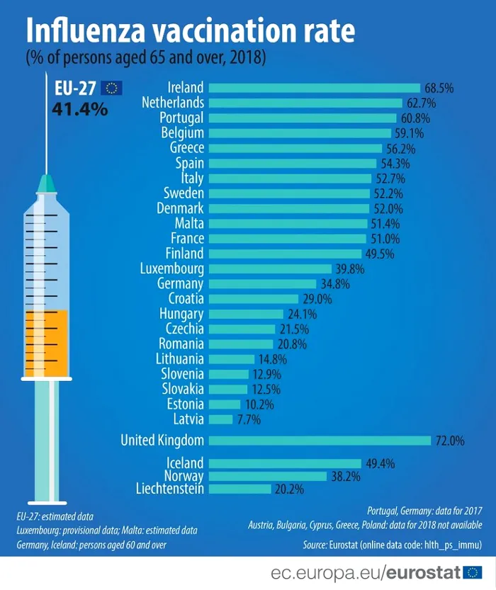 Dintre cele 23 de state membre pentru care sunt disponibile date recente, au existat diferențe considerabile în ponderea persoanelor vaccinate împotriva gripei: aproape 7 din 10 persoane cu vârsta de 65 de ani și peste (69%) au fost vaccinate în Irlanda, cu ponderi ușor mai mici în Olanda (63%), Portugalia (61%, date 2017) și Belgia (59%).