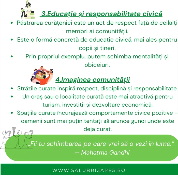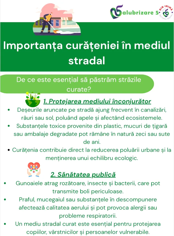 Străzile curate reflectă o comunitate disciplinată și responsabilă. Un oraș îngrijit devine mai atractiv pentru turiști, investitori și contribuie la dezvoltarea economică locală. În plus, spațiile curate încurajează un comportament civic pozitiv, oamenii fiind mai puțin tentați să arunce gunoaie în locuri deja curate.