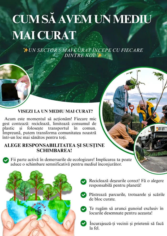 „Visezi la un mediu mai curat? Acum este momentul să acționăm! Fiecare mic gest contează: reciclează, limitează consumul de plastic şi folosește transportul în comun. Impreună, putem transforma comunitatea noastră într-un loc mai sănătos pentru toți. Un Sector 5 mai curat începe cu fiecare dintre noi”, transmite Salubrizare Sector 5.