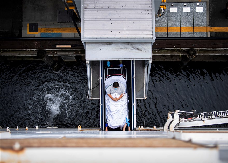 CALIFORNIA | Marinarii transportă un pacient pentru a fi internat la bordul navei spitalului USNS Mercy, desfășurat ca spital de trimitere pentru pacienții non-COVID-19, din Los Angeles, pe 6 aprilie.