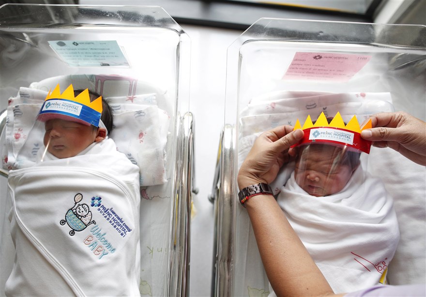 THAILANDA| O asistentă thailandeză pune scuturi pentru față nou-născuților ca o precauție împotriva pandemiei coronavirusului la spitalul Princ Suvarnabhumi din Samut Prakan, pe 8 aprilie.