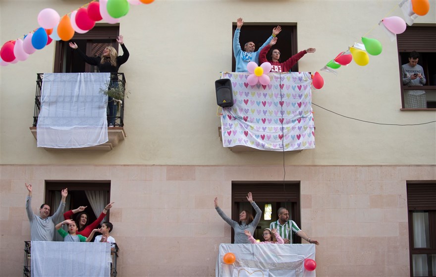 SPANIA | Vecinii sărbătoresc propunerea de căsătorie a Elenei Gonzalez cu Juan Manuel Zamorano în Ronda în timpul blocării coronavirusului din 7 aprilie.