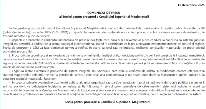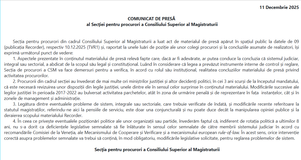 „Secția pentru procurori din cadrul Consiliului Superior al Magistraturii a luat act de materialul de presă apărut în spațiul public la datele de 09 (publicația Recorder), respectiv 10.12.2025 (TVR1) și, raportat la unele luări de poziție ale unor colegi procurori și la concluziile asumate de realizatori, își exprimă următorul punct de vedere: