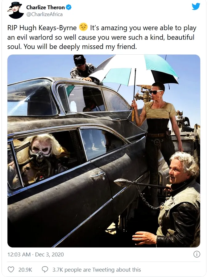 Charlize Theron, care a jucat alături de Hugh Keays-Byrne în „Mad Max: Fury Road” (2015), a spus că actorul „va lipsi tuturor”.